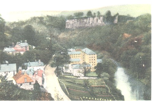 An "Orthochrome" postcard by A & G Taylor of London. It was posted in 1908, but the picture may have been taken as early as 1890. The large building in the centre is Masson Mill, built by Richard Arkwright in 1783. In 1897 the Mill was handed over to English Sewing Cotton Co, and the Mill was expanded. In 1907 a tall chimney was built on the Mill.