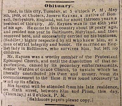 Joseph Raynes died in 1849, and is buried in Spring Grove Cemetery