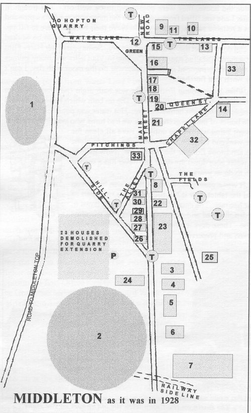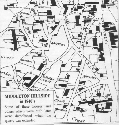 On the Hillside there were 23 houses which were demolished when the quarry expanded (they couldn't stop production). These were some of the best houses in Middleton at that time. After the houses had been taken down the managers decided to work underground which they still do today. The underground roads and channels being worked go under the moor and also to Hopton where there is now an entrance. Hopton had two quarries when I was young.