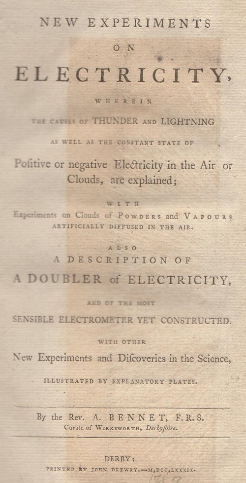 Doubler and the experiments with atmospheric electricity and electrification of dusts. Later they read of his Magnetometers using spider web to suspend tiny pointers, in one case the single down seed from the head of a dandelion, which indicated on tiny ivory scales. In 1789 he published his book, New Experiments in Electricity, wherein the causes of thunder and lightning as well as the constant state of positive or negative electricity in the air or clouds, are explained; with experiments on clouds of powders and vapours artificially diffused in the air. Also a description of a doubler of electricity, and of the most sensible electrometer yet constructed. With other new experiments and discoveries in the science, illustrated by explanatory notes, by A. Bennet, 1789. The illustrations include Lichtenberg figures. The contact electrification precedes that of Volta.