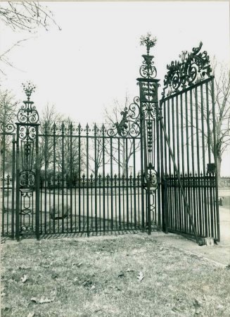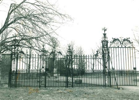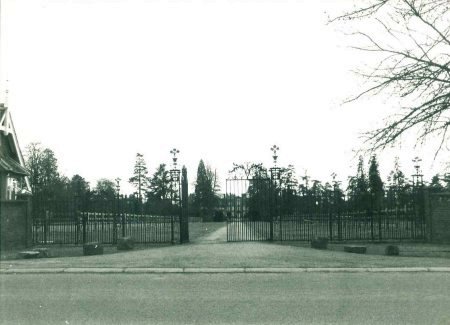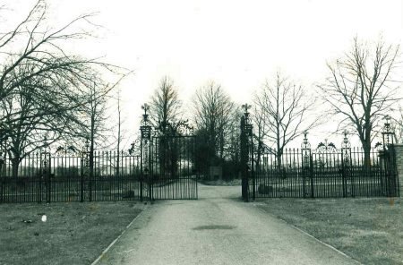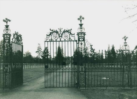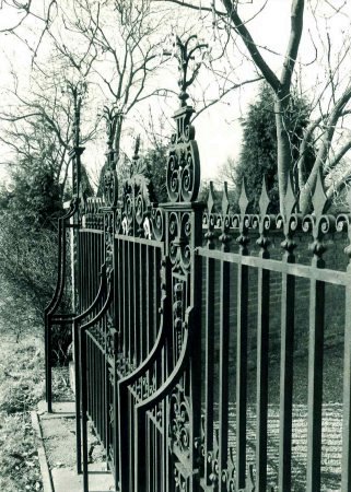 When the Wood family gave up Wirksworth Hall in about 1900 they took with them these entrance gates, the work of the renowned Robert Bakewell. They now stand at the entrance to Henley Hall, near Ludlow, Shropshire. Thanks to Barry Joyce for these pictures, taken Feb 1979. |