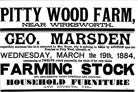 Rebecca does not show up on the Census in 1851 in Wirksworth, but she is present at Pitty Wood in 1861 as a spinster. After the death of her sister Mary Ann(2) she married her brother-in-law, John Storer, at Matlock Parish Church on the 31st. October 1872. The witnesses at their marriage were William (4) Jessop and Emma Wigley. Strangely it is recorded in the Matlock Parish register that Rebecca’s father was deceased but he wasn’t! He must have approved the marriage because they lived with him at Pitty Wood Farm. She continued living there with her Father after she was widowed on the 19th March 1878. and then stayed on after his death until she sold up at an auction on Wednesday 19th. March 1884. She moved to Oldham to join her two step-sons, William J. Storer and Samuel B. Storer, and died in 1906.
