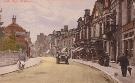 "Old English Hotel", watched by two shopkeepers and a well dressed