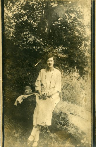 Elizabeth (Bessie) POTTER, taken about 1923, by my father Ernest BUTLIN in Pitty Wood (near Wirksworth) Elizabeth Potter (nee Robinson) was my great grandfather's sister. My great grandfather was Gilbert Pidcock Robinson born at Ashbourne 5 Jan 1842 and died at Manchester 30 June 1894. James Robinson, (see X242), was his half brother. James' mother was Mary Haycock. Their father Edward Robinson's first wife. Edward married again to Ann Salt nee Pidcock 7 June 1837 at Ashbourne.