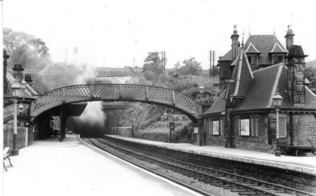 In 1849 the Manchester, Matlock, Buxton and Midlands Junction Railway opened a line to Rowsley passing through Cromford. The station-master's house and the up line waiting room were built in c.1855 and 1860 in coursed gritstone with slate roofs. The design by G H Stokes bears witness to his work in France with his father-in-law Joseph Paxton in the 1850s. The station buildings on the down line were built in 1874. The Butterley Company erected the ornate footbridge in 1885.