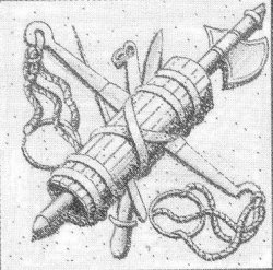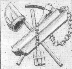 Plaques from the Old Moot Hall, showing Miner's tools of