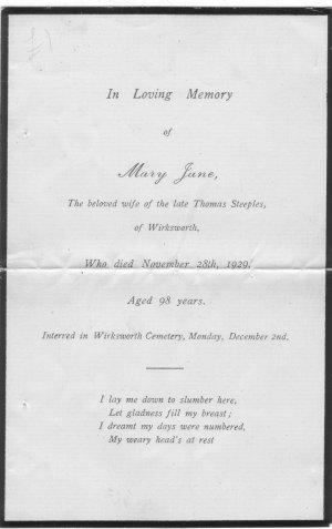 Mary Jane, wife of Thomas STEEPLES of Wirksworth, died 28 Nov 1929