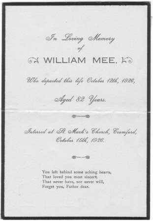 William Mee - born Cromford, birth registered at Bakewell Q2 1876. Unverified