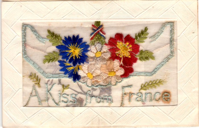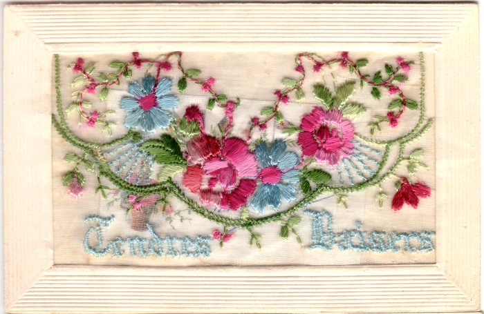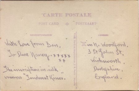 silk embroidered cards for auction, from "Ben" to "Miss Nancy Woodford,